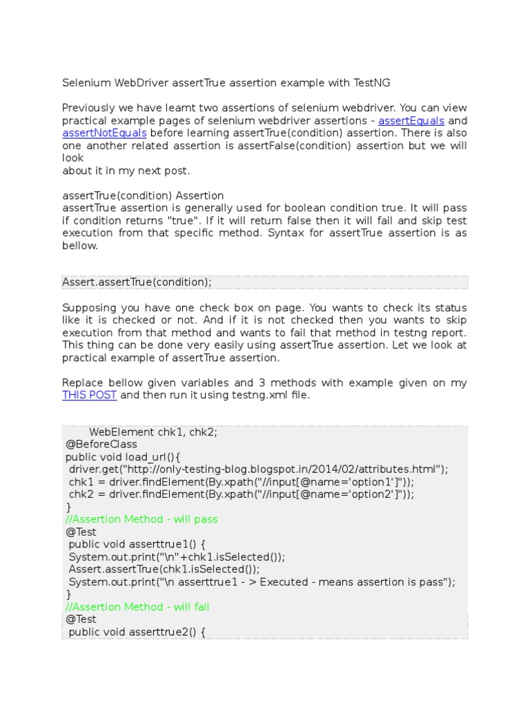 Post Your Answer Discard By clicking "Post Your Answer", you acknowledge that you have read our updated terms of serviceprivacy policy and cookie policyand that your continued use of the website is subject to these policies. In the first condition, I take a title value correctly and use assertEquals statement and in the second condition, I take incorrect title value to deliberately throw the exception.